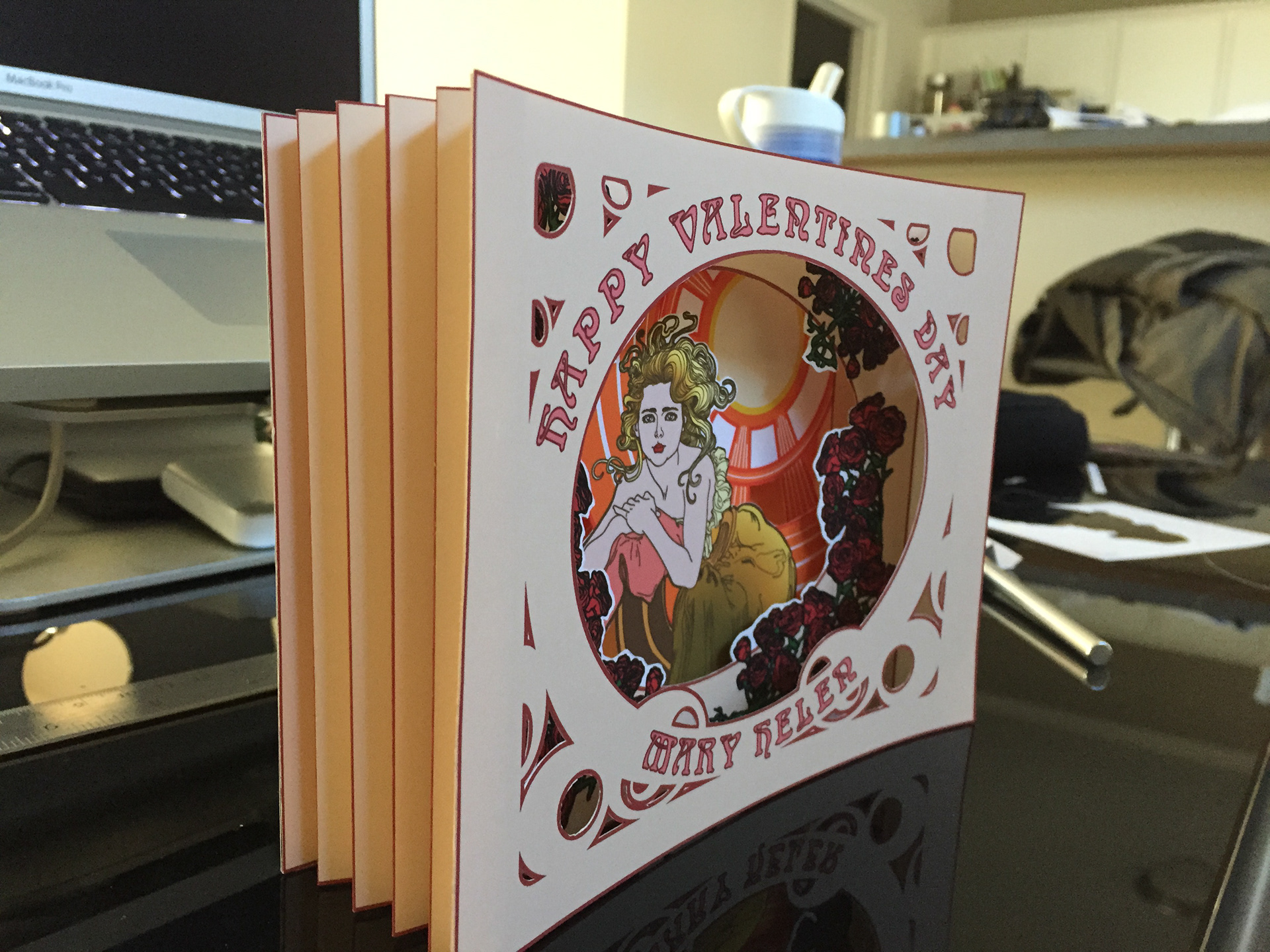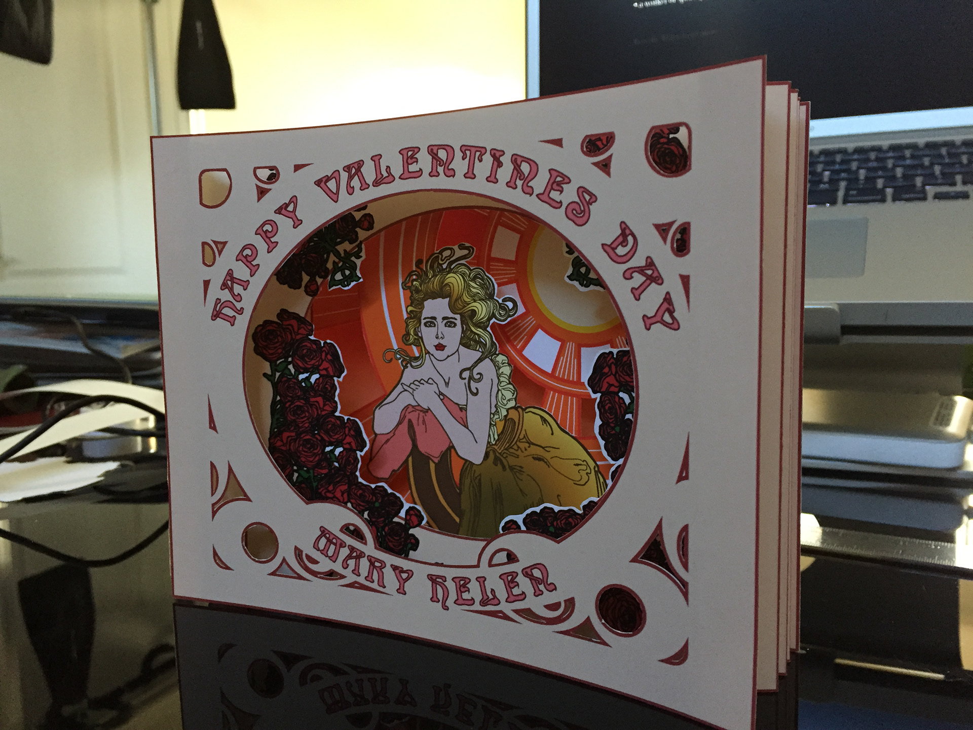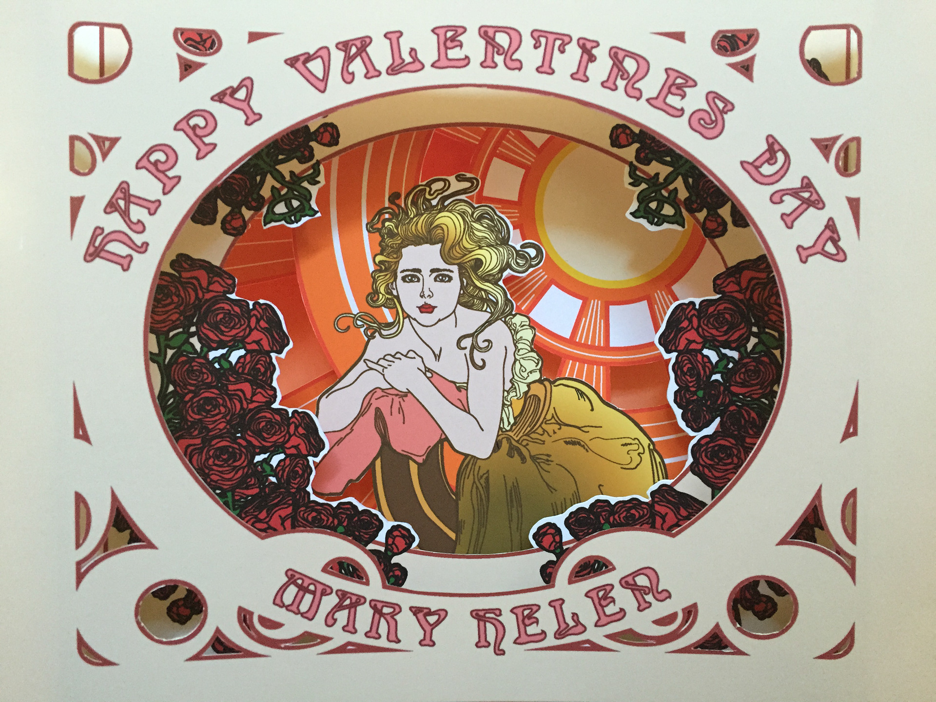 A Valentine's Day Card that I did for a friend. I used an Alphonse Mucha inspired illustration style and Victorian-era "peepshow" card design.